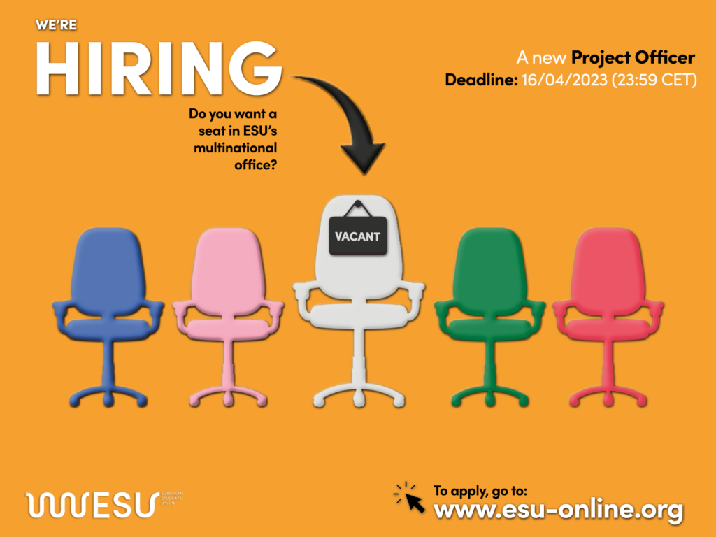 Are you a value-driven professional passionate about the student movement and advocating for quality and inclusive education? Then apply now for ESU’s position: we are looking for a Project Officer to join our team and implement our work to promote “Equal educational and social opportunities in an open and democratic Europe where students shape a sustainable future.”