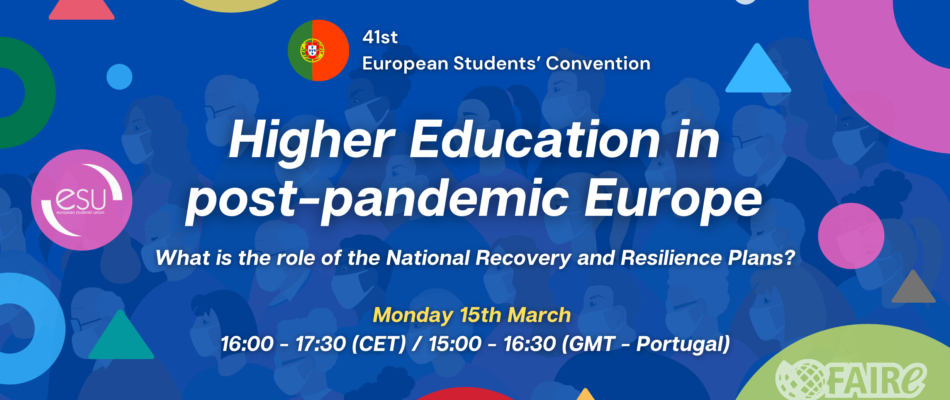 Channelling this approach in light of the ongoing EU roll-out of the Next Generation EU Program, FAIRe, in collaboration with ESU, will be holding a high-level panel titled Higher Education in post-pandemic Europe: What is the role of the National Recovery and Resilience Plans?. The panel will take place over Zoom between 16:00 and 17:30 CET on Monday the 15th of March.