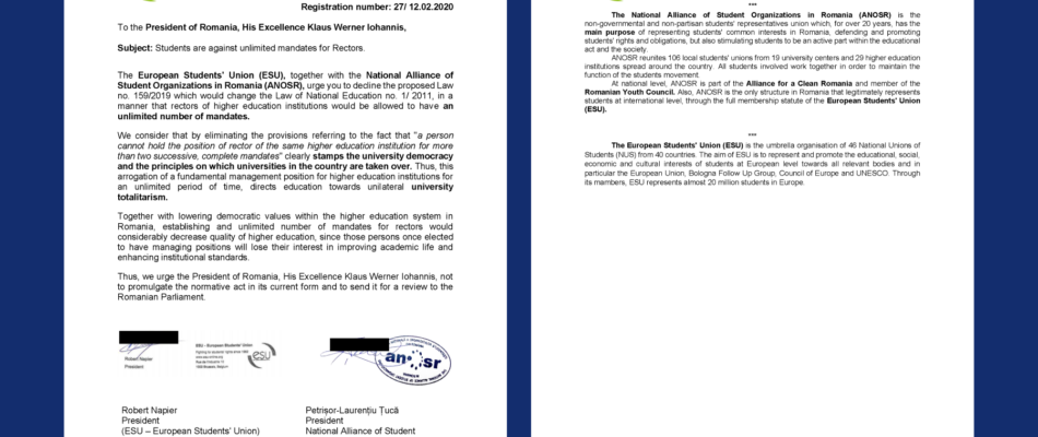 The European Students’ Union (ESU), together with the National Alliance of Student Organizations in Romania (ANOSR), urge you to decline the proposed Law no. 159/2019 which would change the Law of National Education no. 1/ 2011, in a manner, that rectors of higher education institutions would be allowed to have an unlimited number of mandates.