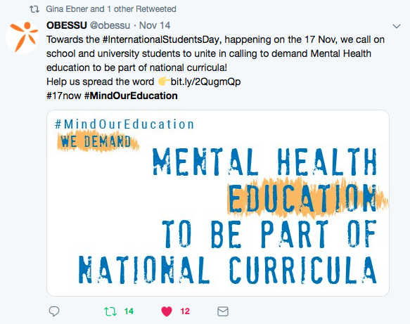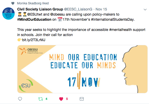 This year, the campaign focused on the Mental Health of students under the title “Mind Our Education”. One of ESU’s strategic political priorities for the period 2018-2020 is to advocate for a better specific support for students with health issues including mental health.